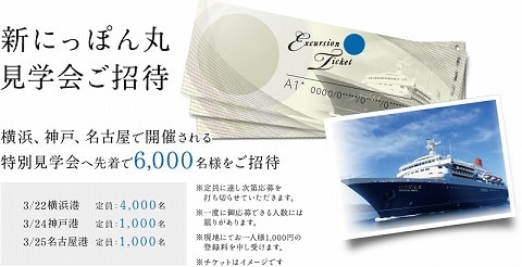 横浜港 横浜港大桟橋国際客船ターミナル 最寄駅:みなとみらい線「日本大通り」駅 集合時間:2010年3月22日(月・祝) 09:45〜11:20(乗船開始10:15) 最終下船時間:2010年3月22日(月・祝) 12:00 神戸港 中突堤旅客ターミナル 最寄駅:最寄駅:JR線「元町」駅/阪神線「元町」駅/地下鉄線「みなと元町」駅 集合時間:2010年3月24日(水) 09:00〜10:50(乗船開始09:15) 最終下船時間:2010年3月24日(水) 11:30 名古屋港 ガーデン埠頭ポートビル 最寄駅:地下鉄線「名古屋港」駅 集合時間:2010年3月25日(木) 14:30〜16:20(乗船開始14:30) 最終下船時間:2010年3月25日(木) 17:00