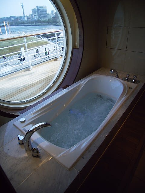 おや、この時間帯だとずいぶん空いていますね。14:30スタート組は、7Fラウンジ前の通路が両方向いっぱいになるくらいに混んでいました。 ジャグジーバスの丸窓は、外から覗かれそう・・・