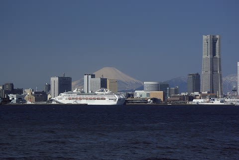 横浜港と富士山と船、3拍子揃って絵葉書そのものの光景です 船客も富士山が見えたというのは嬉しいでしょうね!