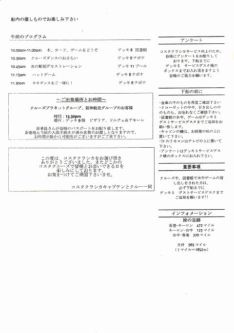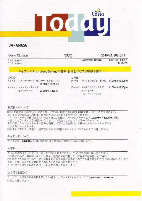 下船日ということもあって、この日は1枚紙で裏表構成でした。 表側は食事のスケジュールと清算。 キャビン受け渡し時刻と荷物の件ですね。 キャビンは8:30に出なければいけないのですが、船内にはお昼過ぎまでいることになるので、手荷物をどうにかしないといけません。 これは手荷物預かりのサービスが用意されてましたね。 ただし、この書き方。日本語的にはちょっと変で... "AM9:00からPM1:00の間にお越しください" って、どういう意味だと思います? 普通に読むと、受付の時間がそれに該当すると思ってしまうのですが、実際は、手荷物預かりのオープン時間でした。 つまり、AM9:00からPM1:00までの間、預かってくれるという意味。 1:00前には取りに行かないといけない訳ですね。 食事はビュッフェ形式ですがお昼まで供されるのはありがたいです。