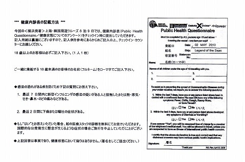 1:オンラインチェックイン 2:パスポートコピーの作成 乗船受付に必要だそうです。 個人の控えも必要ですから、2部あったほうが良いですね。 3:健康内診表への記載