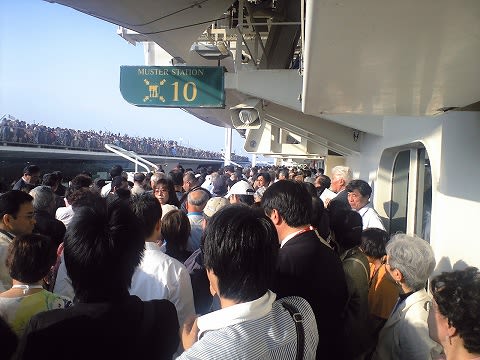 16:15から実施。 まだ出港前です。 警報が鳴ったらシーパスカードを持って定められたステーションへ向かわなければなりません。今回、船は左舷着きで、私たちの船室も左舷...っていうことはステーションも左舷なんですよね... 桟橋から丸見えですよ...(^^;) というわけで、こんな絵に...