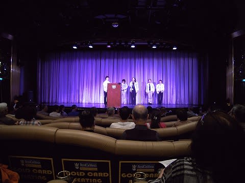 ドキュメントの各記述の右上にはガイドブックの該当ページが記載されています。 なかなか親切。 さてこの説明会、時間になっても始まらない... これ、実は下船説明会でもこの調子で、そのときはついに乗客側の怒りが爆発したんですけど、そもそも時間を切っておいてその時間に始めないって言うのは、時間どおりに来た乗客を馬鹿にしている話だって言うことが理解できていないんでしょうね。 実はミキさん、この後も始終こんな感じで火に油を注ぐようなことばかりしていたような印象があります。『この人たち、船に乗ったことあるのかしらん???』っていうのが正直な印象。とにかく手際というか要領が悪すぎ。 そんなミキのメンバーさんたちです。