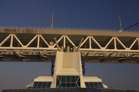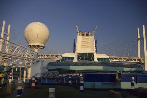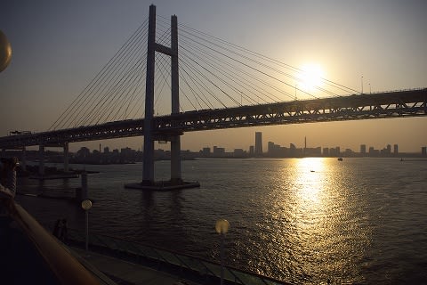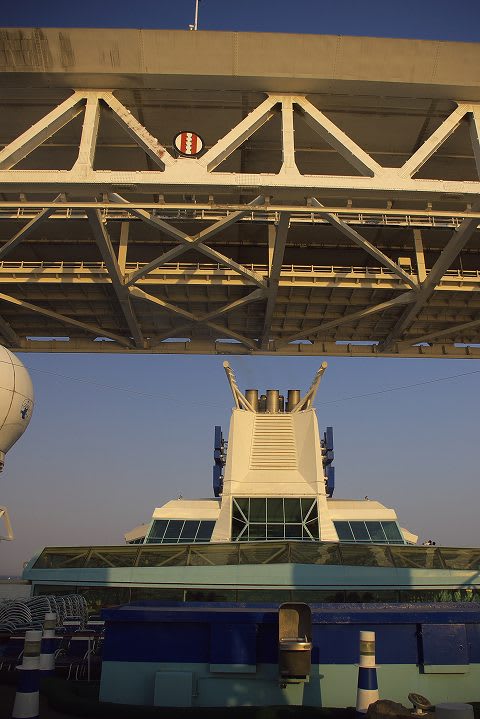 与太さん、こんにちは。 なんとも羨ましい五月晴れ!賑わい! 10日の午後は、時折り小雨のぱらつく曇り空でした。 19時出港ということもあり、見送りの方も少なく 私達は、17時45分〜出港前に夕食でした(笑) 避難訓練が17時〜で、ずいぶん慌ただしかったです。 今朝、所用でみなとみらい(桜木町)に行きましたが 数日前降り立った街が、ずいぶんと昔の事のように感じられました。 写真で見るとベイブリッジ、ずいぶんギリギリですね。 以前、コペンハーゲンのブリッジを通ったことがありましたが その時もかなりスレスレな感じでハラハラドキドキしました。