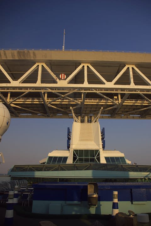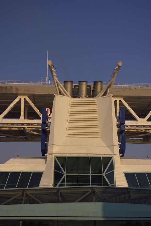 さて、ベイブリッジをくぐるのもコレだけ大きな船ともなるとイベントになります。 横浜を出入りする船で、自分が乗っている船としては過去最大(いままでは飛鳥Ⅱ)。 とはいっても、下から見てる分には実際のクリアランスなんて解らないんですけどね...(^^;) 横浜に限らず、思い返してみても、大型のクルーズ船に乗って橋をくぐった経験って意外と無いことに気付きます。瀬戸内行った事ないし、長崎の女神は完成前だったし...(^^;) シンガポール、香港、LA、ブリスベーン、西地中海は橋無いんですよね... (あ、バルセロナは可動橋だった...) 結構スリルが味わえますね... ではじっくりとご覧くださいませ...
