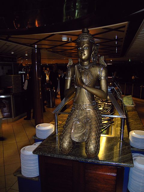 な〜る〜ほ〜ど〜!! 目からウロコです。次回から、絶対セカンドシーティングにします。 ちょっとオスシをつまんで、メインダイニングへ・・ 何てオツなのでしょう。 (食べた後、階段の上り下り+デッキ3周くらいは 必要かもしれませんが・・) デザートは、直接目で見て決められるバフェの方が ハズレが少ないのですよね〜