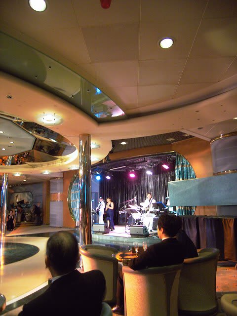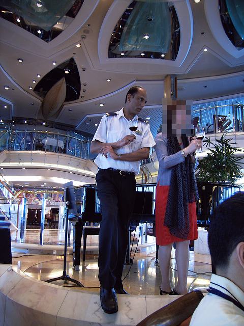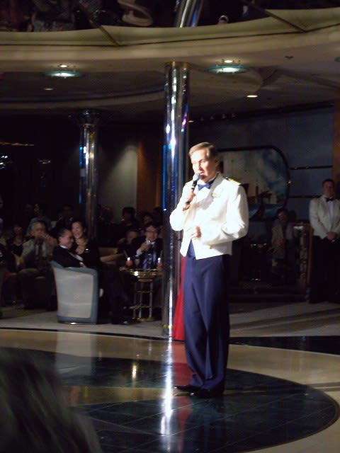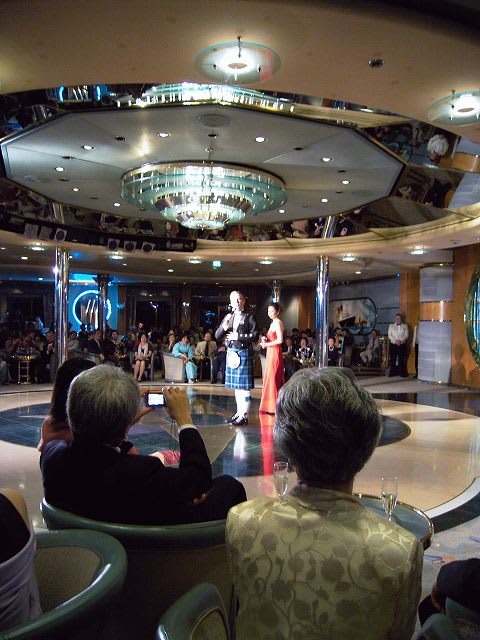 この日はフォーマルナイトということで... ちょっと時間があったので、1stのキャプテンズパーティに乱入。 しっかりとお酒も戴いて...v(^^) RCIだからということで、フォーマルといってもダブルのジャケットで済ませてしまったんですが、乗客の皆さんは気合入ってましたね...RCIの船でタキシード着てる人なんて初めて見ました...(^^;) ここで初めてキャプテンのご尊顔を拝見。 ラプソディのタレントキャプテンとはだいぶ違うなぁ... 1stの乱入は最後の方のちょっとだけだったので... この様子から、前の方に陣取った方が良さそうだったので、2ndの時は早めに会場へ。 会場の入り口は2箇所あるんですが、それぞれで記念撮影をしている様子。 聞いていると、右舷側でキャプテン、左舷側でスタッフキャプテンとチーフエンジニアとの写真ということらしい...そうと聞けば右舷に並びますよね...(^^;) RCIのキャプテンって、こういうイベントの時しか姿が拝めないので... この乗船記の最初の方に載せたキャプテンの写真はこの時の写真です。 比較的最初の方に並んでいたので前の方の席を確保できました。