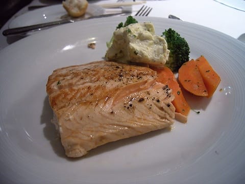 いや、"海鮮醤で味付け"って... 鳥だよ.... 連れ合いさんは主菜からはギブアップ...オルタネィティブから "大西洋サケの直火焼き"