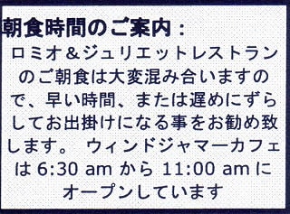今日も終日航海日。 乗客の方も船内に慣れて来た頃合。 リラクセーション系のイベントの紹介ですね。 中国のイミグレはなかなか厳しい... 船なのにパスポート持参で下船ですか... また、韓国も健康調査票が必要とのこと。 日本国内ではすっかり沈静化してしまったインフルエンザですが、イミグレの世界では、まだまだ旬の様相... エクスカーションもラストスパート。 ショーはプロダクションショーですね。 ショータイムも通常に戻って夕食前です。 「完璧に素晴らしい」... まぁ、こういう自画自賛系、アメリカっぽいです。 TIPSにコメントでもいただいた朝食情報が... これ...