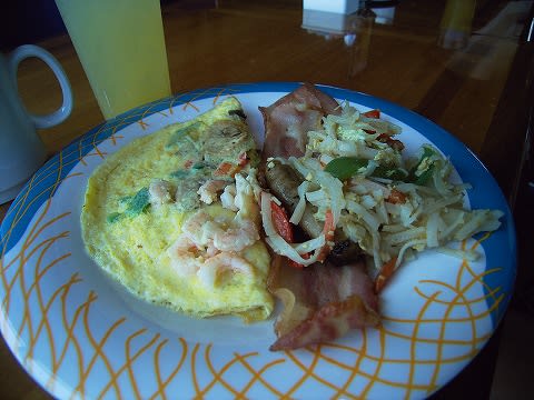 オムレツはステーションで焼いてもらったもの。 具材はオーダーできます。 中央のベーコンは、通常のものではなく厚手のもの。 ※これ、後半はなくなっちゃいました... ソーセージが一本と、この日は炒麺にしてみました。 この外に、パンケーキとワッフル、牛乳とヨーグルト、最後にフルーツっていうのが定番。 連れ合いさんは、コレ