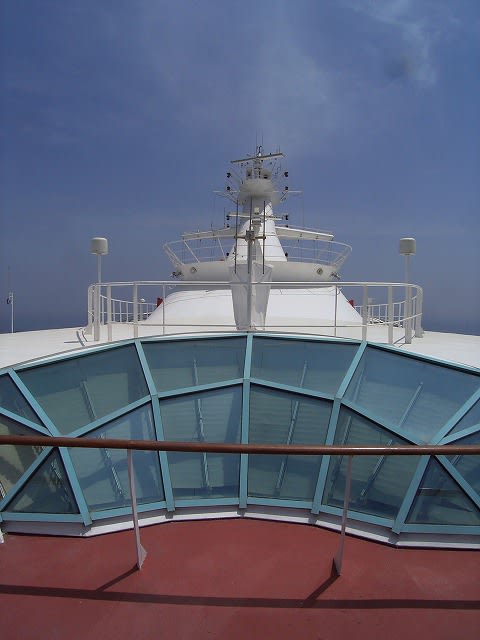 いやぁ〜、良い天気です。 10デッキの通路のところの水色の部分がウォーキングトラックで、一周400m。 まぁ、アメリカ流で行くと、4週で1マイルという勘定になりますが、日本的には5週で2kmって言う感覚ですね。 10デッキは船を一周りできますので、こんなシーンも拝めます。