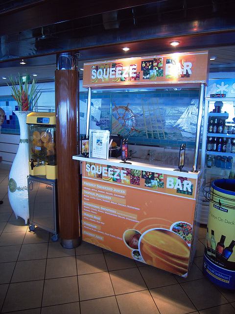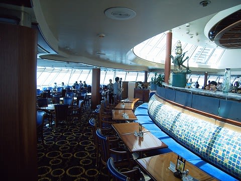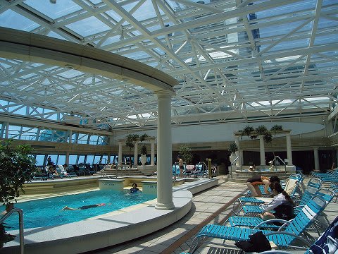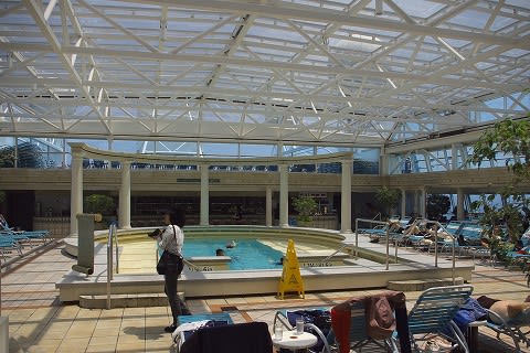 こんにちは。 ソラリウムのジャグジーには夕方入りに行ったのですが、水が冷たく(28℃)「ぶぇ〜。加熱してないよ〜ん」と、飛び出して以来、ジャグジーもプールもご縁がないままでした。 キャビンのTV30チャンネルでは、航路表示の上に文字のテロップで、プールの水温を表示していたんですが、ソラリウムの水温が30℃を超えたら行こう!と、思っていても、いつも28℃でした。残念! ソラリウムはなぜか人も少なく、落ち着いた、いい雰囲気でしたね。 しかし、カナヅチの私はプールにはビート板か浮き輪が必須ですが、そんなモノありませんね。水深1.7mでは溺れてしまう…(泣)
