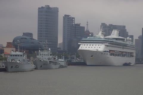 朝食はウィンジャマーですませて、いよいよ上海上陸です。 前の記事にも書きましたが、港の歓迎ぶりは最悪... オフ会に参加してくださった皆さんととりあえず街中へ繰り出します。 目的はナイトクルーズの乗り場の確認と地下鉄の駅。 地下鉄は当初、4号線の"楊樹浦路"駅が近いと思っていたのですが、新しい地下鉄が完成していて、その10号線の"天潼路"駅が近そうということがくりぴんさんの地図で判明。 しかもこの10号線、"豫園"の最寄に駅があるということで... この"天潼路"駅を目指します。 途中、以前に乗ったナイトクルーズのチケット売り場を確認したんですけど、誰も居ない...(^^;) 一応、価格とかは出てたんですけどね... ここでチケットが買えるかどうかは確認できず... ここで、"豫園"を目指す皆さんとは別れて、我々は外灘へ向かいました。 外灘の端っこから、Legendが停泊しているターミナルを見るとこんな感じ。