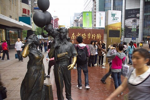 成隆行蟹王府のある九江路から南京路へ出て、一路、西を目指します。 ちょうど地下鉄の南京東路駅のある辺りから人民広場まで、南京路は歩行者専用道になっています。 路のいたるところにモニュメントが...