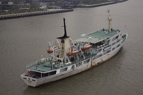 豪華なクルーズ船と並んで停泊していたら、新鑑真は、まるでパイロット船ほどにしか見えませんね。 大阪の通天閣と、上海のテレビタワーとを比べるようなもの。