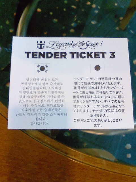 小さいようですが、これでも実は100名強の乗客を乗せる事が出来ます。 この船を4隻で回すらしい...でも、逆に言うと、それだけなんですよね... ちょっと不安を感じたその1ですね。 今回、このレジェンドには1600名近い乗客が居ます。 全員が上陸しないまでも、1000名以上は上陸することになるでしょう。 1000名だとしても単純に考えてのべ10回の渡船が必要になります。 4隻で回して、1隻あたり2.5回。 1回の往復に1時間近くかかるようなので、これだけでも単純に計算して2時間半かかる訳で...あらら...なんだかすでに怪しい数字になっちゃってます。 前回乗った同じRCIのラプソディの時も、プーケットとペナンが渡船だったんですが、この時は自前のテンダーだけではなく、現地の小船も渡船として使ったんです。勿論、4隻なんていう単位ではなくもっとたくさんの船が傭船されてました。 それに比べると、今回は見るからにお粗末。 大丈夫かなぁ... テンダーのチケットです。