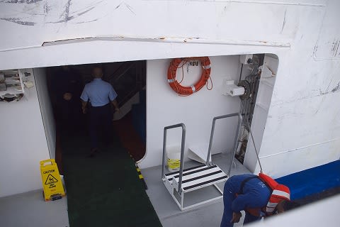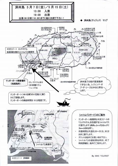 例によって、あまり使いみちが無い資料です。 だって、タダでさえ上陸時間が短いのに、こんな島の全体マップを渡されてもねぇ... 実は済州島って結構大きな島で... 普通に観光すると、島の半分を回るだけで6時間くらいはかかる島なんです。 しかも、島の観光の中心は北東の方で、今回、船が着いた南西から行くのは殆ど不可能な感じなんです。ミキさん、ちょっとは頭を使おうよっていう感じです。 そうこうしているうちにやっとアナウンス。 フリーの上陸客のテンダー乗船は15:00過ぎになるとのこと... ひぇ〜...(^^;) あわせて、最終の渡船時刻も19:00に変更されました。 でも、渡るのが2時間以上遅れてるのに、帰る方は30分だけかい!! っていう不満の声があちこちから... ここでもまたフラストレーションが乗客たちに溜まっていきます... 15:10頃、やっとテンダーに乗ることが出来ました。