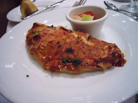 これはRCIの定番ですね。モナークでもラプソディでも食べたメニューです。 主菜は... まずは"トマト、バジル、モッツアレラチーズのカルツオーネ"