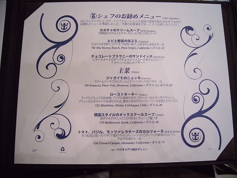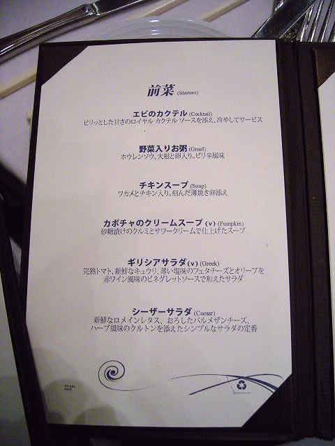 さて、この日はスケジュールが大幅にずれてしまったこともあり、夕食はオープンシッティングに変更になってしまいました。まぁ我々2ndシッティングの人間にとっては、早く食事にありつけたのでむしろありがたかったのですが...食事の開始は19:30位でした。 オープンになってしまうとテーブルが変わってしまうので、いつものウェイター氏じゃなくなるっていうのが最大の危惧なんですが、幸い、4日目同様、ウェイター君が呼んでくれたので彼の担当テーブルに座る事が出来ました。いつものテーブルの隣。ラッキー... 前菜メニューです。