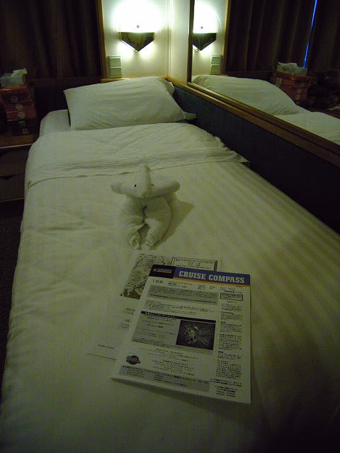 おはようございます。 タオルアニマル、そう言えば、猿と蛇はありませんでした。 「犬が好き」とメモを残したら、ブルドッグと、別な日に子犬(ハンドタオル使用)を作ってくれていました。(^_^)v ところで、旅行社主催の船内見学会ですが、今まで申し込みしたことがありませんが、見学会後の売り込みが煩いということは無いのでしょうか? それを考えると、躊躇してしまうのです。(^_^;)