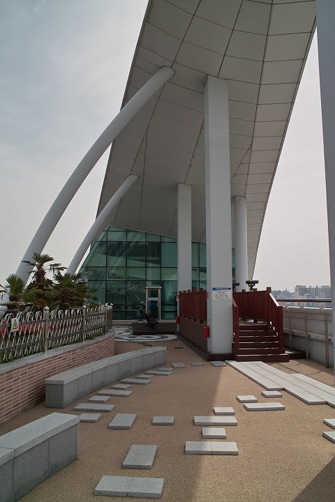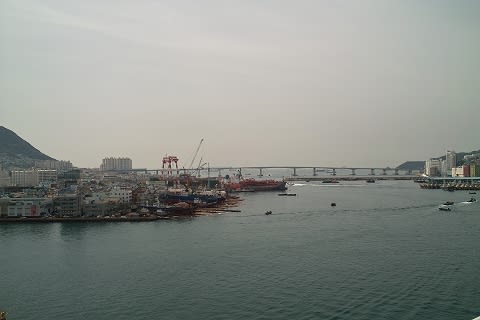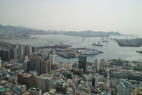 釜山タワーは、海抜69mのところに高さ118mで建てられているのだとか...コレをして、龍頭山公園を海抜180mのところにある公園としている記事が多いようです... 現時点では、高所から釜山を眺める観光ポイントですが、いま建設中のロッテ百貨店の横のタワーが完成してしまうと、ココも廃れちゃうんでしょうね... タワーから釜山港を眺めます。