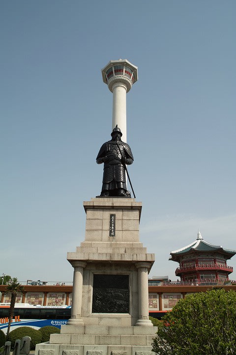 桟橋からのシャトルバスは実は2系統あったんですね。 ひとつはロッテホテルにある免税店へ直行するバス。 もう一本が龍頭山公園を経由してフェニックスホテル(チャガルチ市場の近くにあるホテル)へ向かうバス。 最初、桟橋に待っていたのは免税店行きのバスだったのですが、後から来たバスがフェニックスホテル行きとアナウンスされたので慌てて乗り換え... 最初の停車地"龍頭山公園"を目指します。 「龍頭山公園(ヨンドゥサンこうえん)は、大韓民国釜山広域市中区にある公園。龍頭山と呼ばれる丘が公園となっており、山頂部には釜山タワーがある。」 (出典:wikipedia) シャトルバスは20分ヘッドで運航されている(実は時間どうりには動けなかったようですが...)ということだったので、チャガルチへ直行するのをやめて公園で下車。 釜山最初の観光です。 まずは"李舜臣(イ・スンシン)将軍の像"