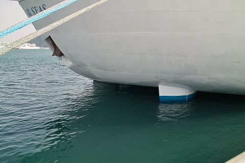 真下から見上げると、ブリッジウィングの床の覗き窓が...