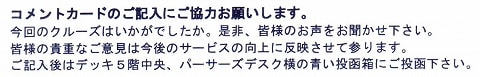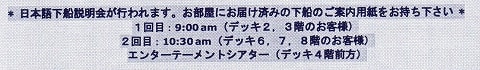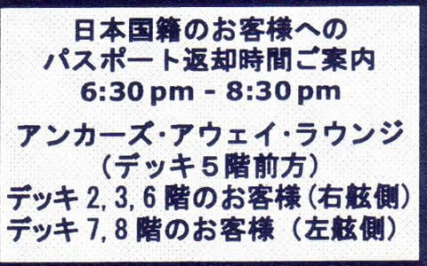 クルーズもいよいよ最終日。後は下船日を残すのみです。 そういう意味で、この日は盛りだくさん... パスポート返却のご案内