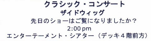 げ、でもこの時間、下船説明会とかぶってるなぁ...大丈夫かなぁ... という危惧があたってしまったんですが... ミキさんも要領悪すぎ... 詳細は記事の方で... クラシックコンサート。