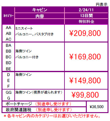 ☆ポートチャージ・政府関連諸税:1名あたりの料金で、別途申し受けます。 (SGL使用の場合、\63,500となります)