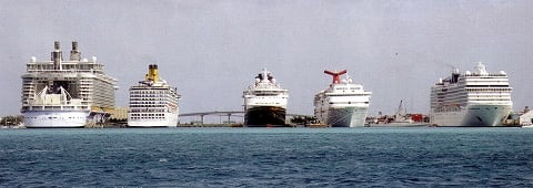 5隻のクルーズ船が並んでますが、向かって右からMSC、カーニバル、ディズニー、コスタ、オアシスと続いてる訳です。