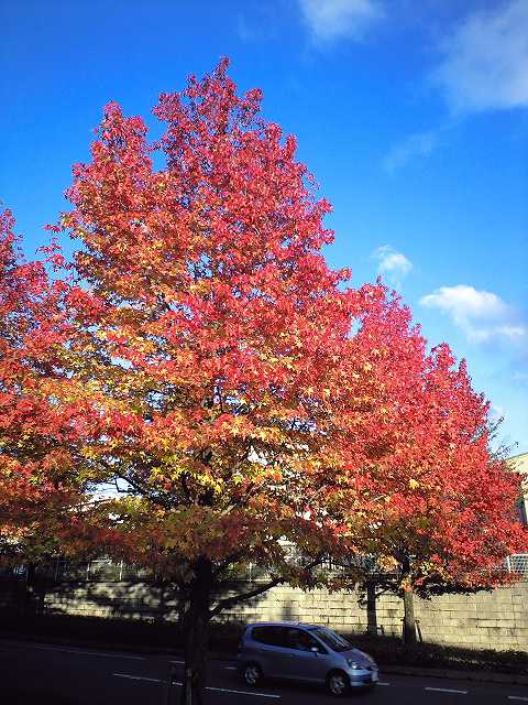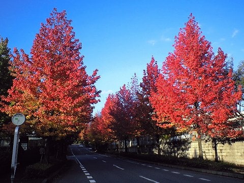 見事なモミジバフウの紅葉の並木道ですね。 青空に映えてとても綺麗です。 ぽちっとね