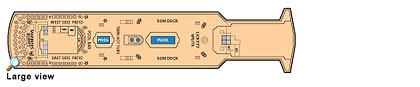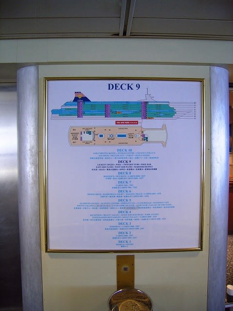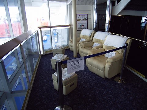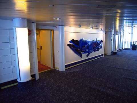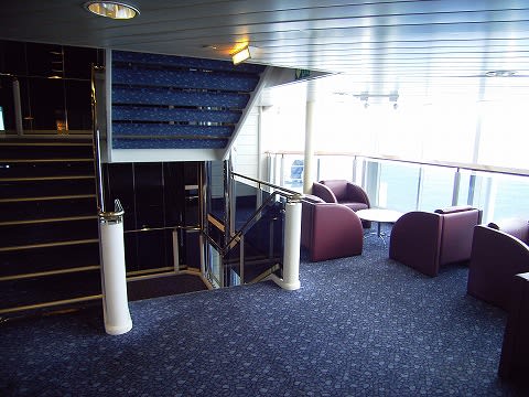 この船の構造的に面白い部分なんですけど、一般的な船だと、階段室ってエレベータの対面が階段っていう構造なんですけど、この船は、階段とエレベータが同一側にあります。 中央がエレベータ。その両脇に階段っていう具合。 それと、階段室の部分にはキャビンがないので、ある意味展望室のような構造になっています。なので、ソファーは勿論、こういうSPAの出張サービスエリアなんかもセッティングされてたりします。