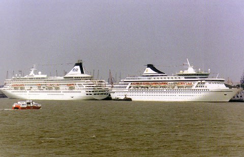 Royal Cruise Line時代の"Crown Odyssey"との2ショット。 ぱっと見、ちょっと似ていませんか、この2隻。 あまり知られていませんが、実はこの2隻、設計会社が同じなんです。 デンマークの会社です。