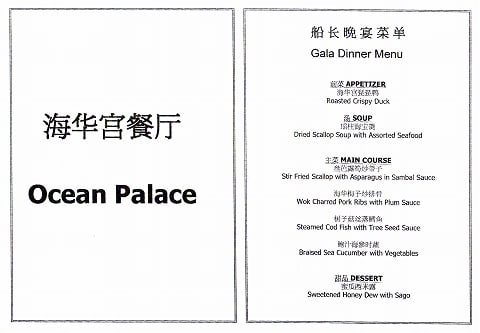 いわゆる"イベントつき夕食会"ですかね...(^^;) 会場は洋食の"Four Seasons"と、中華の"Ocean Palace"の2箇所。 先にもご説明したとおり、キャプテンが出張るのは"Four Seasons"のみ。 だけど、再三お伝えしているように、この船、洋食今ひとつなので... 折角のディナーですから、我々は中華を選択。 メニューです。