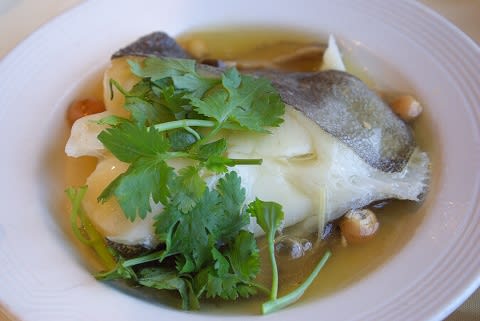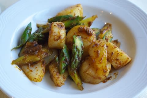 どちらもグラスでサーブ。 メインです。 まずは又も帆立で、アスパラガスとの炒め物。