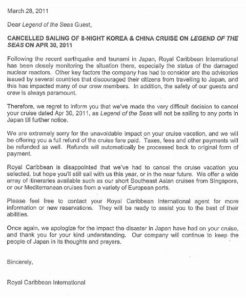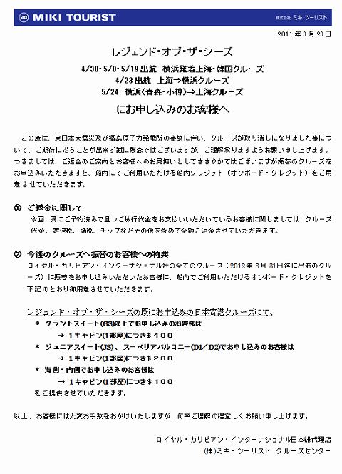 一部の予約者(ミキでオンライン予約をされた方です。)にはすでにメール等で中止と返金の通知が渡っているそうです。旅行代金は全額返るようですが、例えば横浜発や上海発のワンウェイで予約されていた方は航空券もあわせて予約されている訳で...その処理が困りますね...