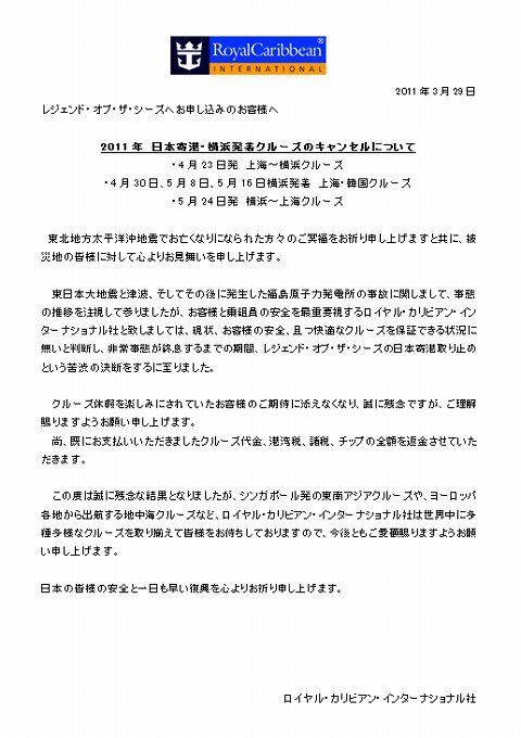 欧米各社の日本寄港が次々とキャンセルされる状況の中、危惧されていたRCIの日本発着ですが、ついに発表がありました。