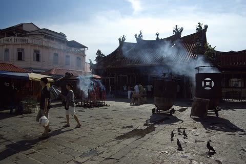 ペナン最古の中国寺院。すごい線香の煙... 正面からは逆光だったのでちょっと裏へ...