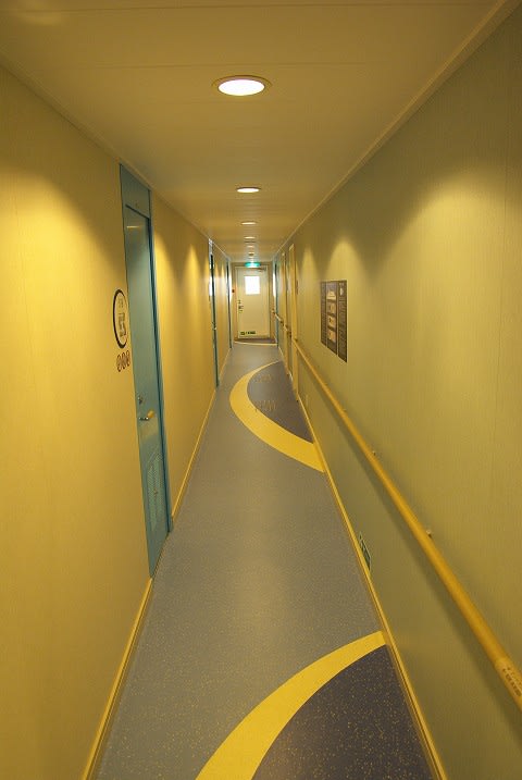 船尾へ向かう廊下です。