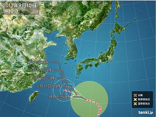 2011年9月15日4時30分発表 台風15号は、15日3時には南大東島の東約260kmにあって、西へ毎時25kmで進んでいます。中心気圧は996hPa、中心付近の最大風速は18m/sです。この台風は、15日15時には南大東島の北約70km、16日3時には沖永良部島の東南東約120km、17日3時には沖縄本島近海に達する見込みです。台風周辺海域および進路にあたる海域は、シケるため警戒が必要です。次回の台風情報は、9月15日10時30分の予定です。