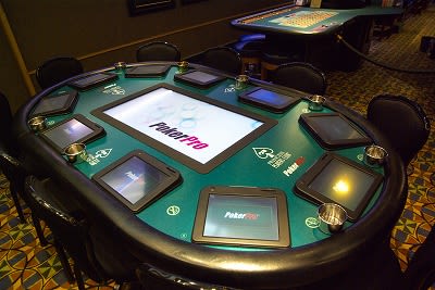 こんにちは。写真で出ています機械式のポーカーテーブルですが、HALのWesterdamにもありました。で、勝負の仕方ですが、ポーカーは基本的にやっている人間同士の対戦になります。機械になっているのはディーラー(ポーカーの場合はカードを配って、ゲームの進行をするだけ)の人件費削減目的と思われます。