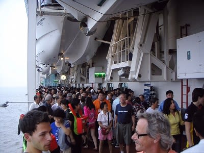 ボートドリルすごい人!整列する前でしょうか? 5デッキまで波しぶき.... クルーまで船酔いするのも納得 ^^;