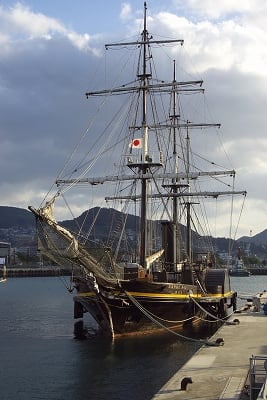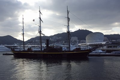 1987年に復元された観光丸。もともとハウステンボスに居た船ですが、例のワンピースの海賊船の就航に合わせて、ハウステンボス側から長崎市へ活用を打診していたという事。
