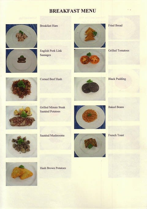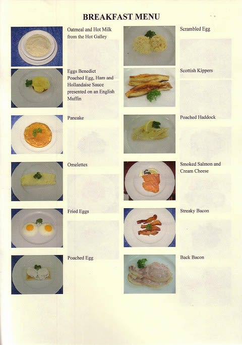 オハヨウございます。 凄い「BREAKFAST MENU」ですネェ! 我が家でクリスマスより豪華です。 あと、与太爺さんのサイト見てると感じるんだけど、「船内写真」が沢山あって、これヒジョーニ役に立ちます。 だってサァ、CRUISEする時、コースや値段も気になるけど、 やっぱ、容貌と性格でしょう? で しょう ??