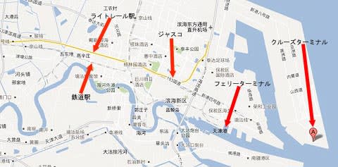 一番右端の吹き出しの(A)ってあるのが天津国際郵輪母港(天津国際クルーズターミナル)の場所になります。