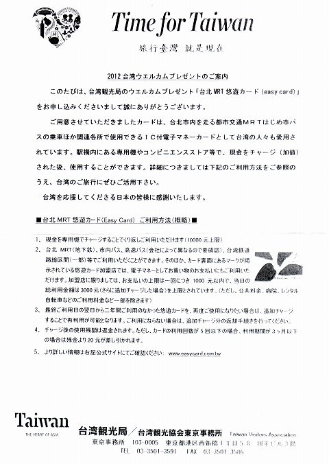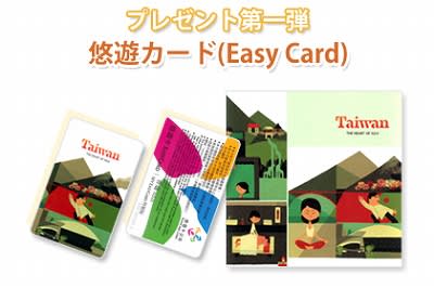 第1弾のプレゼントは、旅行台北の地下鉄(MRT)やバス、台湾鉄道(一部)をはじめ、一部のコンビニ、スーパーマーケット、スターバックス、タクシー、台北市立動物園、図書館ほか悠遊カード利用契約店、契約施設で使用することができる台湾最強のICマネーカード「悠遊カード(Easy Card)」です。