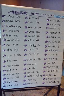 そう、キャプテンズパーティで、クルーズディレクターが思い入れたっぷりで披露する例の乗船客の国別ランキングです。オーストリアまで1名って紹介して、次の"ジブラルタル"と読んだところで聴衆にマイクを向けて、"one!!"っていうレスポンスを貰った後で、ニヤッと笑って"Two!!"って返すアレです...(^^;)