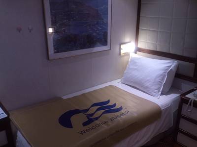 はいぽじしょ さん、こんにちは。 感じの良い部屋でしたよ。狭いけど...(^^;) 最大の欠点はテーブルが無いことでしょうね。 ソファもありません。 これじゃルームサービスも頼めない...(^^;) キャビンの調卓はRCIのインサイドの方が良いかも... あ、でもこっちは冷蔵庫がありましたね... RCIは上級キャビンじゃないと冷蔵庫は無いので... 微妙だ...(^^;)