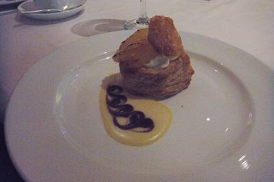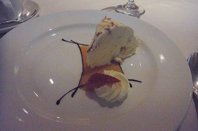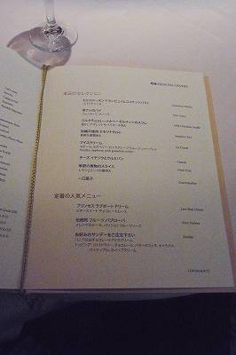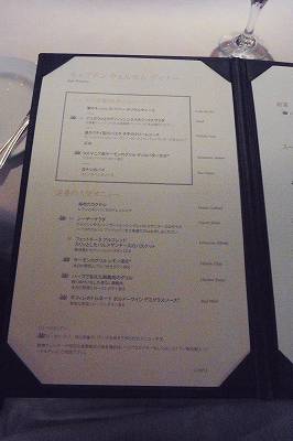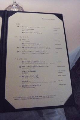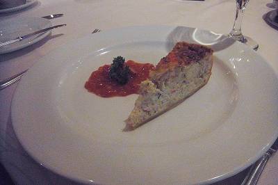 ・蟹のキッシュ、スパイシーチリサルサソース ・フユガラシとラディッシュ、レタスのミックスサラダ ・蝶ネクタイ型のパスタ、子牛のクリームソース ・タスマニア産サーモンのグリル、ディルバターのせ ・洋ナシのパイ